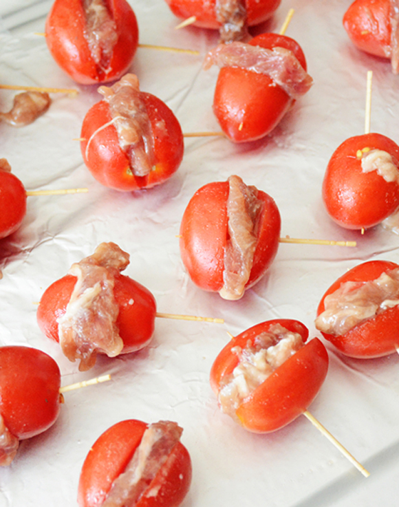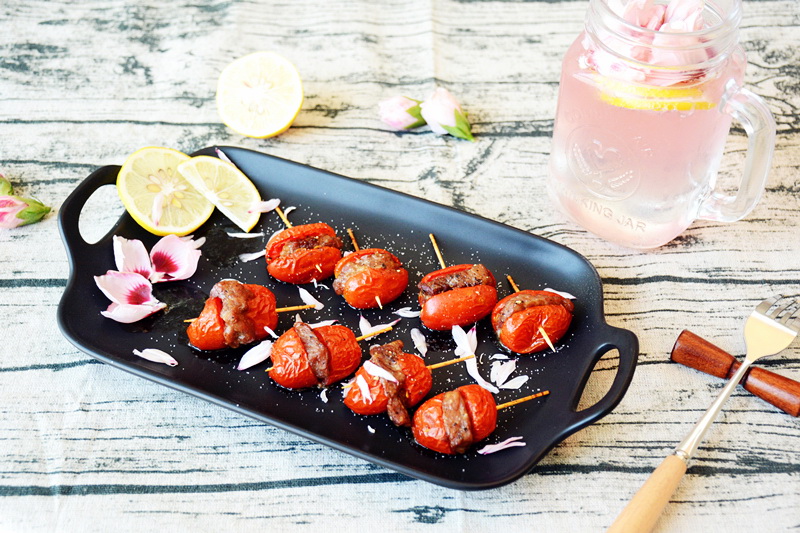 - 材料: 圣农一整块牛排1包 圣女果20个 黑胡椒粉少许 细盐少许 橄榄油视情况而定 步骤: 圣女果洗净,中间切口(不要切断) 一整块牛排完全解冻,平均切成20个牛肉丁 将牛肉丁塞入圣女果,用牙签串好固定 油的锡纸烤盘上摆好,撒上黑胡椒 刷一层橄榄油 放入预热好的烤箱190度中层上下火烤10分钟