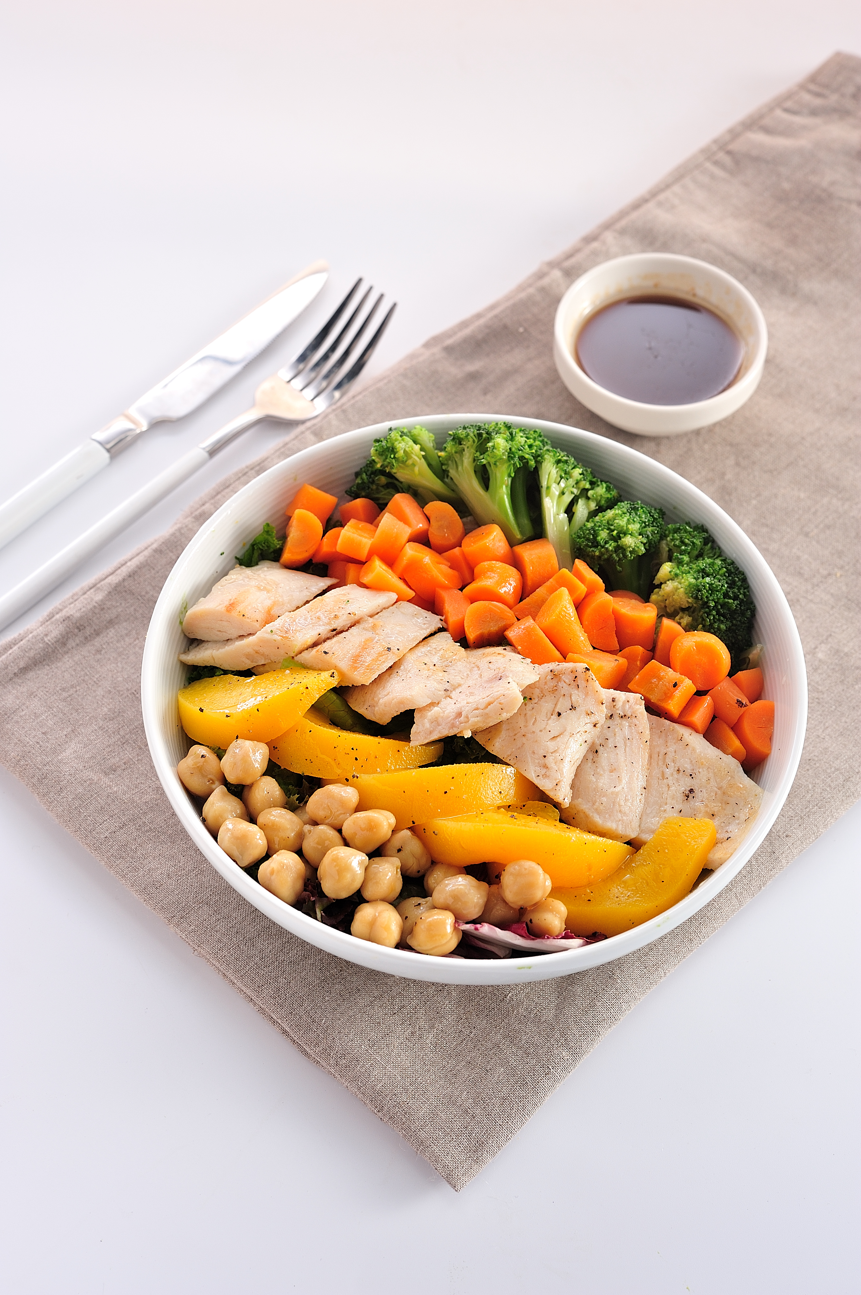 材料: 4度°鸡胸肉1块 鸡蛋1颗 胡萝卜50克 西兰花50克 芒果40克 鹰嘴豆50克 生菜50克 圣农 步骤: 鹰嘴豆提前一晚泡发,第二天煮10分钟捞出 圣农4度°鸡胸肉水煮3分钟后切块 胡萝卜、鸡蛋、芒果切块 盘底铺上生菜后,按顺序放上西兰花、胡萝卜、鸡胸肉、芒果及鹰嘴豆即可