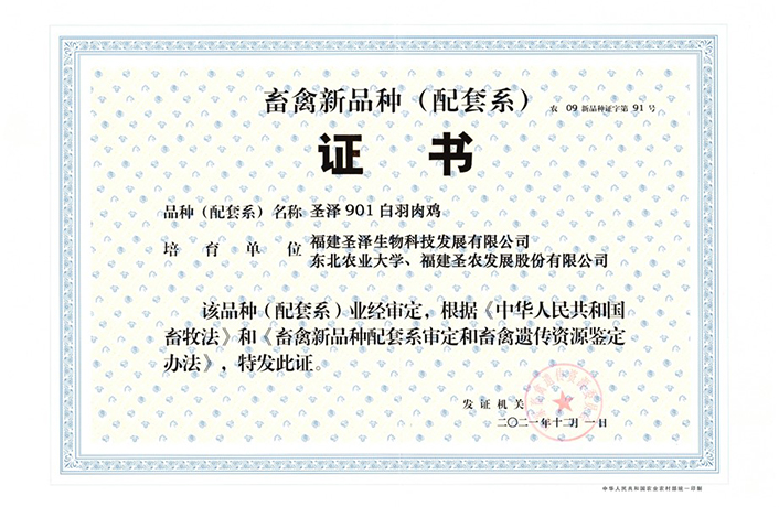 2021年12月,圣农白羽肉鸡配套系“圣泽901”通过国家农业农村部审定认证,获可正式对外销售种源鸡的资格。这意味着来自国外的种源限制被打破,白羽肉鸡养殖企业可以正式购买中国人自主育种的祖代鸡。 |