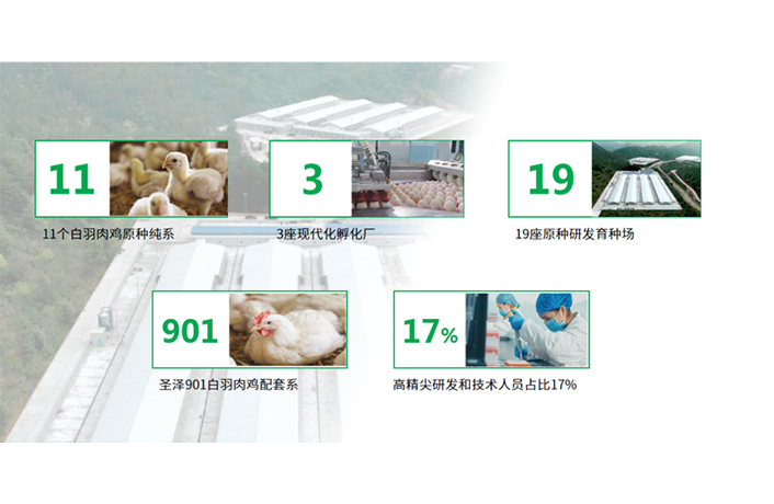 2019年,圣农成功自主培育出中国首批白羽肉鸡种源,并成立圣泽生物,从事白羽肉鸡育种工作。 |